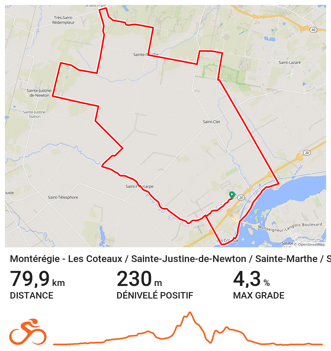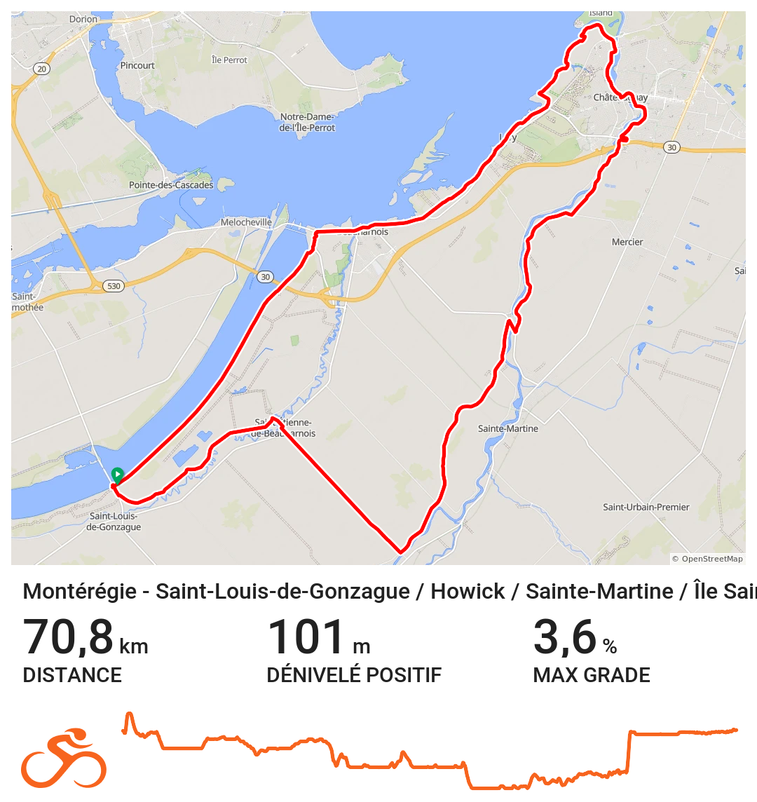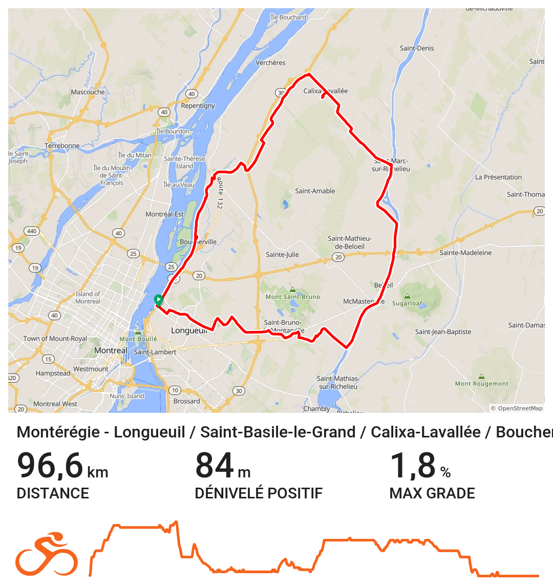 Les parcours proposés sur Projetvelo.ca sont partagés à titre indicatif. Les conditions de circulation, l’état de la chaussée et l’environnement peuvent varier avec le temps. Chaque cycliste est responsable de sa sécurité, du respect du Code de la route et de l’adaptation de sa conduite aux conditions rencontrées